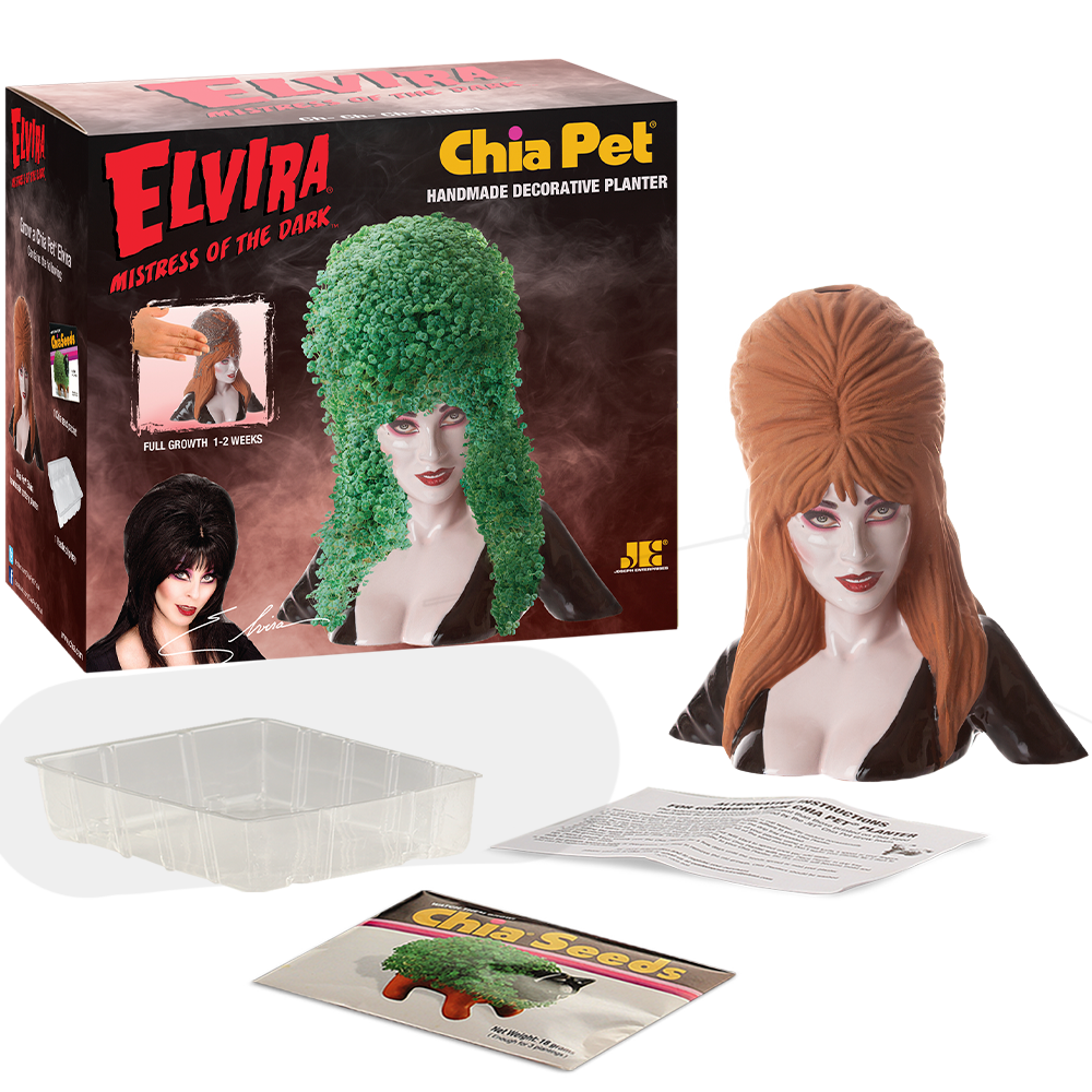 Attention, boys and ghouls! The Elvira Mistress of the Dark Chia Pet is here and ready to be cruelly yours! The horror icon, macabre movie hostess, and undisputed “Queen of Halloween” is now a spooktacular home planter. This terra cotta Elvira bust comes complete with her signature vampy hairdo and plunging neckline. Elvira’s dress and skin are glazed and painted to show off her ghostly pallor and drop-dead gorgeous makeup. Growing your own Chia Pet is easy and fun! Just plant your seeds and watch Elvira sprout a full head of leafy green hair in just 1-2 weeks! The creepy-cool Elvira Chia Pet is perfect for Halloween and makes a great gift for anyone who loves horror, pop culture, or just funky home décor!